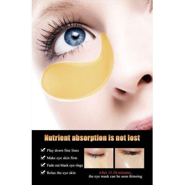 24K gold collagen eye mask, using the new type of infrared thermal import technology allows the natural plant extract collagen protein nutrient completely unidirectional vertical focused on the skin the basic unit, and special polymer network structure to store the aloe vera, green tea and other natural essence and moisture, in lifting facial mask characteristic of surface tension and seepage pressure function, gold powder face mask contains within the efficacy components through the transdermal absorption principle, accelerate the penetration to the skin deep, effective against free radical peroxidation, repair damaged skin cells, can deep separation and bring out the redundant grease secretion, help skin to enhance water balance functions.